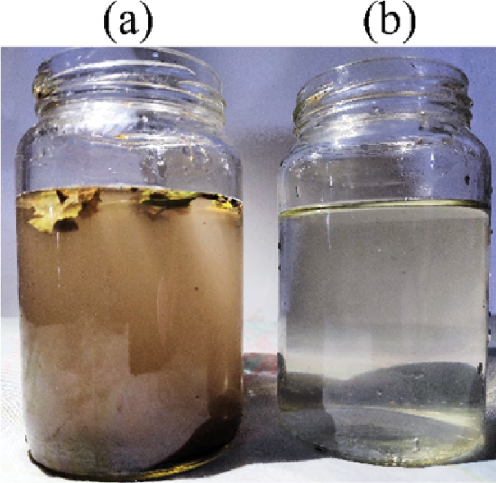 Fig. 5: Resultado macroscópico: (a) ~300 ml de agua contaminada con tierra, hojas, semillas, etc., y (b) ~300 ml de agua filtrada, a través del filtro purificador de agua casero.