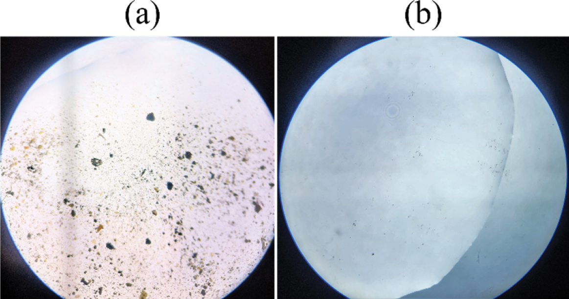 Fig. 6: Resultados microscópico (fotografías a través de uno de los oculares): (a) agua contaminada con tierra, hojas, semillas, etc., (b) agua filtrada, a través del filtro purificador de agua casero.