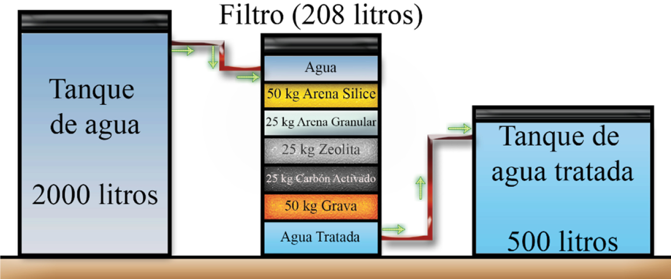 Además del diseño de filtro realizado en el presente trabajo, que puede ser instalado en un sistema conectado a la grifería del suministro de agua domiciliar, una alternativa interesante es conectarlo al tanque de agua, también de uso doméstico, que reserva gran cantidad de agua para sus inquilinos. Esta propuesta fue diseñada en un trabajo cuyo objetivo también plantea una solución a la problemática sobre la contaminación en el suministro de agua. En la misma se propuso que, un tanque de alta capacidad (2000 litros), se conecte por tubería a otro tanque de plástico de ~208 litros como filtro purificador de gran tamaño, con materiales parecidos a los empleados para el filtro de la figura 3, y este último se conecta con otro tanque de gran capacidad (500 litros) que almacenaría este líquido tratado y listo para su uso y consumo. Este sistema fue eficiente, mostrando un puntaje IRCA de 32 (Riesgo Medio) para el agua tratada vs 72 (Riesgo Alto) para el agua antes de pasar por este gran filtro (Avila Bareño y Moreno Figueroa, 2016). La figura 7 muestra un esquema de este aporte.