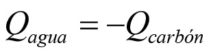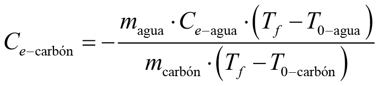 que relaciona el calor sensible absorbido por el agua y el calor sensible cedido por el carbón (vegetal en polvo o activado). Con esta relación, se puede despejar el calor específico del carbón, ce-carbón), para los dos casos, utilizando los datos previamente mencionados: