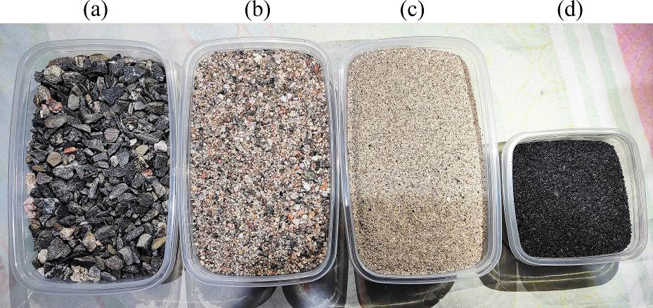 Fig. 1: Cuatro de los materiales en condiciones para la elaboración del filtro purificador: (a) granza, (b) arena gruesa, (c) arena fina y (d) carbón activado.