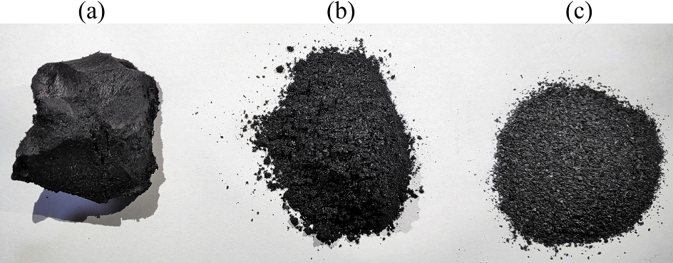 Fig. 2: Muestras del carbón en los distintos pasos del proceso de activación: (a) carbón vegetal, (b) carbón vegetal en polvo y (c) carbón activado.