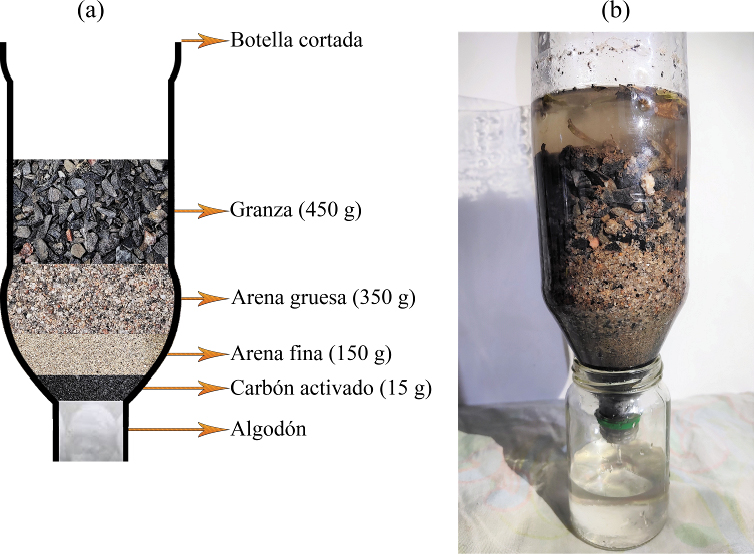 Fig. 3: Filtro purificador de agua casero: (a) esquema representativo, (b) versión real elaborada, durante el proceso de filtración de agua contaminada.