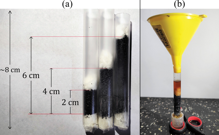 Para evaluar las propiedades adsortivas del carbón activado ante café batido a temperatura ambiente, se empleó un sorbete de plástico inflexible y resistente de 0,5 cm de radio, el cual se recortó en tres fragmentos de 8 cm de largo aproximadamente. En un extremo de cada recorte se colocó una cantidad pequeña de algodón, con un poco de cinta adhesiva transparente que lo sostenga ligeramente sin tapar el orificio, y luego cantidades de 0,53 g, 1,13 g y 1,65 g de carbón activado por encima del algodón de cada fragmento, obteniendo columnas de 2 cm, 4 cm y 6 cm de largo, respectivamente. También se agregó otra cantidad de algodón por encima del carbón activado en cada columna resultante. La figura 4 (a) muestra estos tres recortes mencionados. Cada una de estas columnas fue adosada con cinta adhesiva a una tapita transparente, para fijarlas, y en el otro extremo se colocó un embudo ligero de plástico para facilitar el ingreso del contenido al sistema. La cantidad de café batido añadida a cada columna fue de 4,00 g. La figura 4 (b) muestra este sistema para la columna de 4 cm/1,13 g de carbón activado.