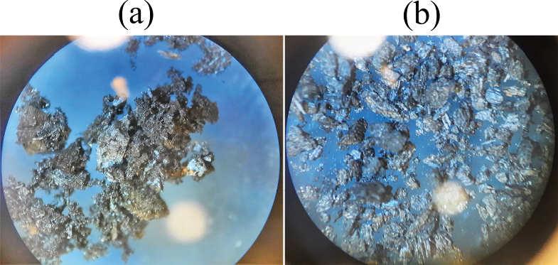 El carbón vegetal en polvo, resultado de pulverizar el carbón vegetal de quebracho blanco (limpio) de origen local, consistía en una muestra que se adhería con cierta facilidad a cualquier superficie (manos, cristales, etc.), incluso a sí mismo como se logra apreciar en la figura 8 (a), donde se aprecia un cúmulo de este en el centro. Mientras que, el carbón activado, con una tonalidad más grisácea, difícilmente se adhería al tacto o con las distintas superficies, ni tampoco a sí mismo como se aprecia en la figura 8 (b).