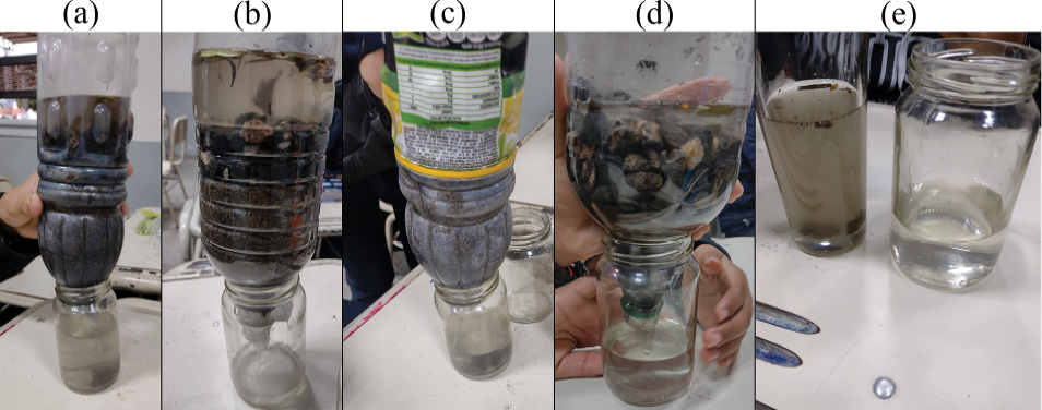 Fig. 9: (a) - (c) Filtro purificador casero elaborado por distintos grupos con todos los materiales detallados anteriormente, (d) filtro purificador casero elaborado por un grupo con granza y carbón vegetal en polvo, y (e) muestra del agua contaminada y el agua filtrada con uno de los filtros.
