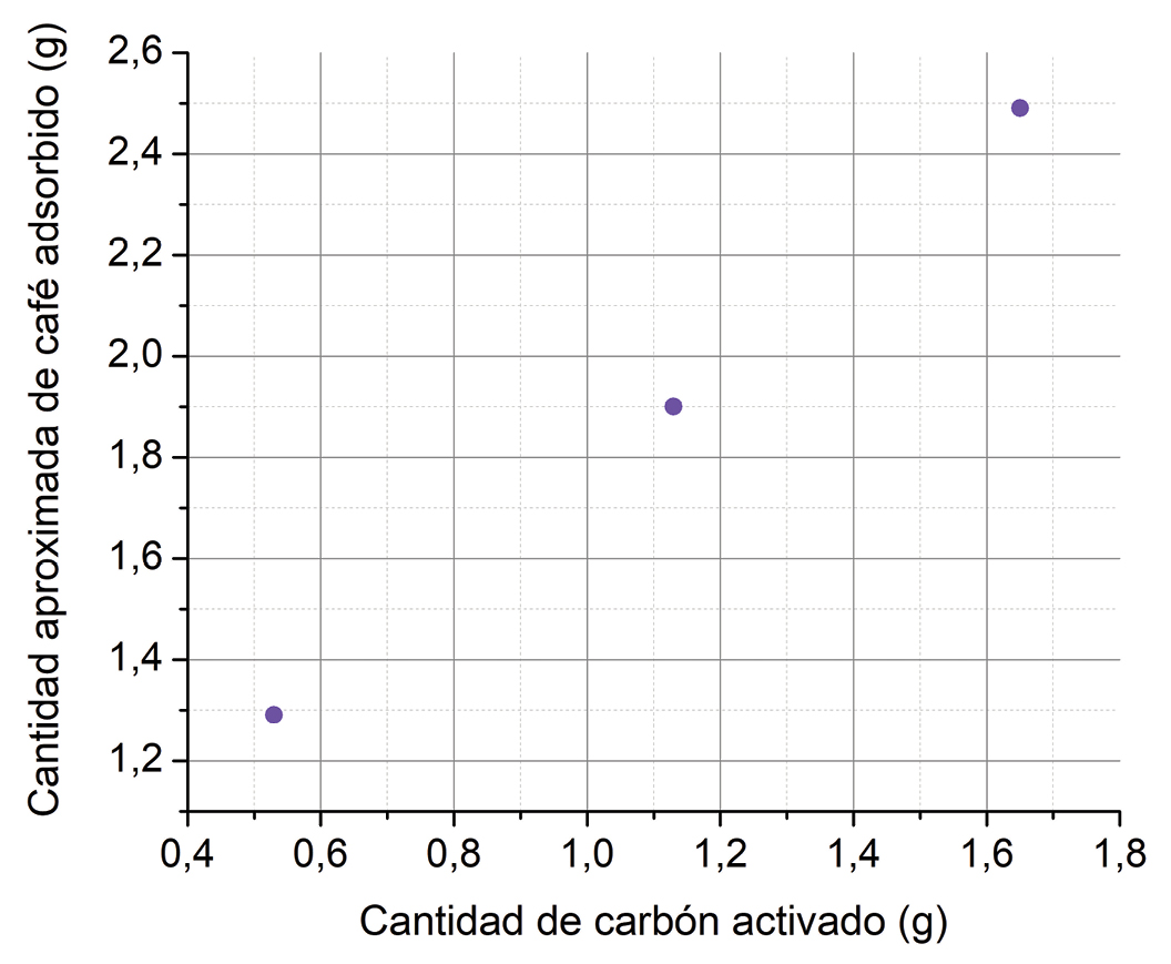 El sistema elaborado para analizar la adsorción de 4,00 g de café a temperatura ambiente como adsorbato, mostró tendencia de proporcionalidad directa con la cantidad de carbón activado empleado como adsorbente. En la columna de 2 cm/0,53 g, de los 4,00 g de café se obtuvo una cantidad de 2,71 g, en la de 4 cm/1,13 g una de 2,10 g y, finalmente, en la de 6 cm/1,65 g una de 1,51 g. Lo que puede indicar que, las cantidades de café adsorbidas por el carbón activado en cada columna son de 1,29 g, 1,90 g y 2,49 g, respectivamente. Esta estimación se muestra en la figura 10.