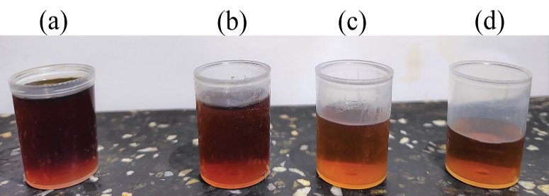 La inserción de las y los estudiantes en la elaboración del filtro purificador casero fue positiva. Cada grupo logró realizar su filtro, con sus propios materiales, siguiendo las instrucciones de pretratamiento guiadas por el docente durante las clases. Estas producciones resultaron ser muy eficientes en cuanto a la filtración de agua contaminada, de las mismas características mencionadas en la metodología, obteniendo agua prácticamente incolora e inodora. La figura 9 (a)-(d) muestra los cuatros filtros, cada uno elaborado por un grupo diferente, durante el proceso de filtración. En el caso de uno de los grupos, el que diseño el filtro de la figura 9 (d), solamente contaba con dos de los materiales, la granza y el carbón vegetal en polvo, ya que no lograron conseguir la arena gruesa y la arena fina. Tampoco realizaron el proceso de activación del carbón vegetal en polvo. No obstante, siguieron correctamente la metodología de pretratamiento para la granza y para la obtención del carbón vegetal en polvo. Por lo que su filtro, aun con esos dos materiales, logró ser casi tan eficiente como los demás.