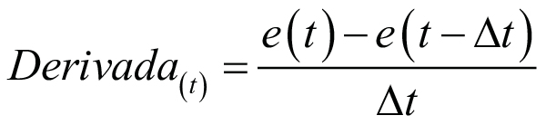 En el caso término derivativo, este mide la tasa de cambio del error. En su forma discreta, se aproxima usando la diferencia finita entre el error actual y el error anterior (3):