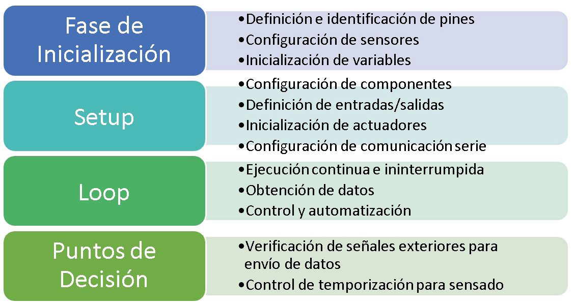 Tanto la automatización como la recolección de datos se basan en un único código programado en la memoria interna de la placa Arduino. A continuación, se presentan las estructuras de algunas de ellas que se definieron siguiendo el proceso de la Figura 2.