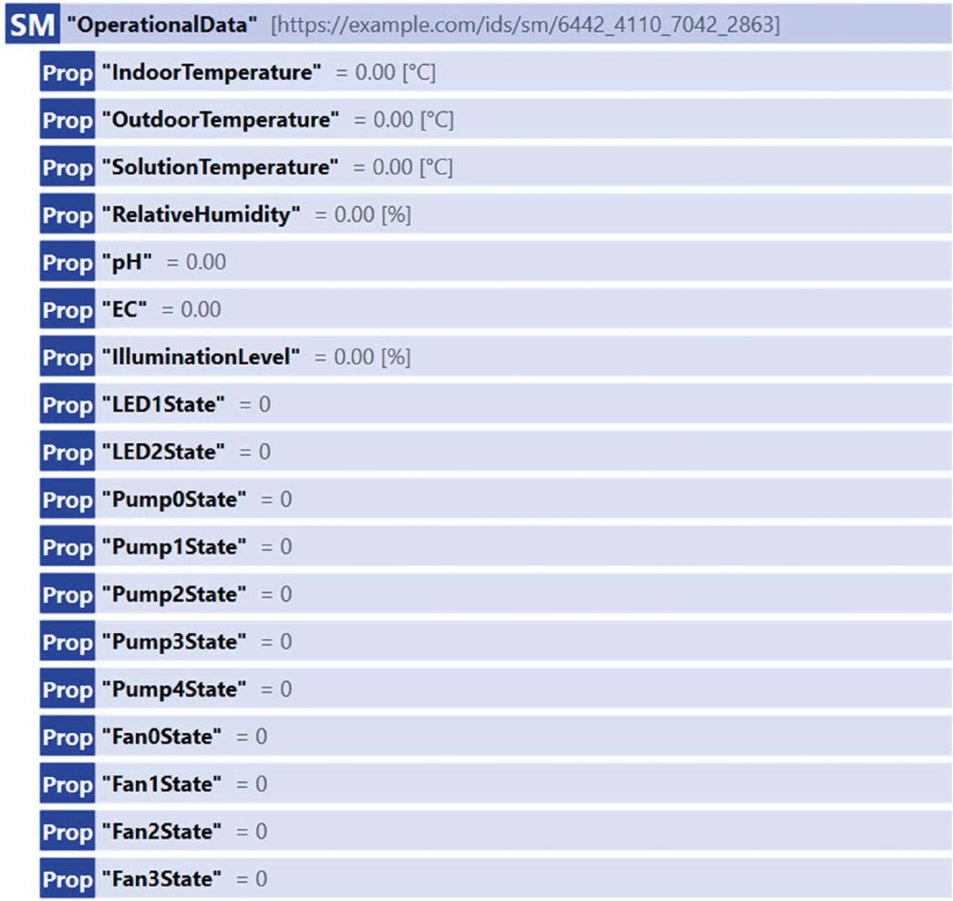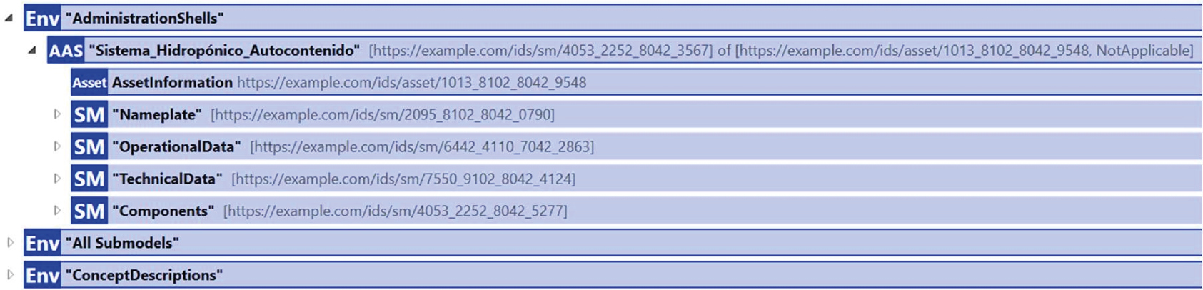 Para ello, se especificó la jerarquía dentro del Sistema Hidropónico Autocontenido, utilizando submodelos y propiedades (Figura 7). Los submodelos son componentes estructurados dentro del AAS que agrupan propiedades relacionadas para describir aspectos específicos del sistema. Cada submodelo tiene un propósito claro y está diseñado para organizar la información de manera lógica y comprensible. Por otro lado, las propiedades dentro de cada submodelo son elementos individuales que contienen datos específicos, como medidas, estados, o configuraciones. Estas propiedades están descritas en detalle, incluyendo su valor, tipo de dato, y una descripción en varios idiomas. Las mismas permiten almacenar y comunicar información precisa sobre las características y el funcionamiento de los componentes del sistema.