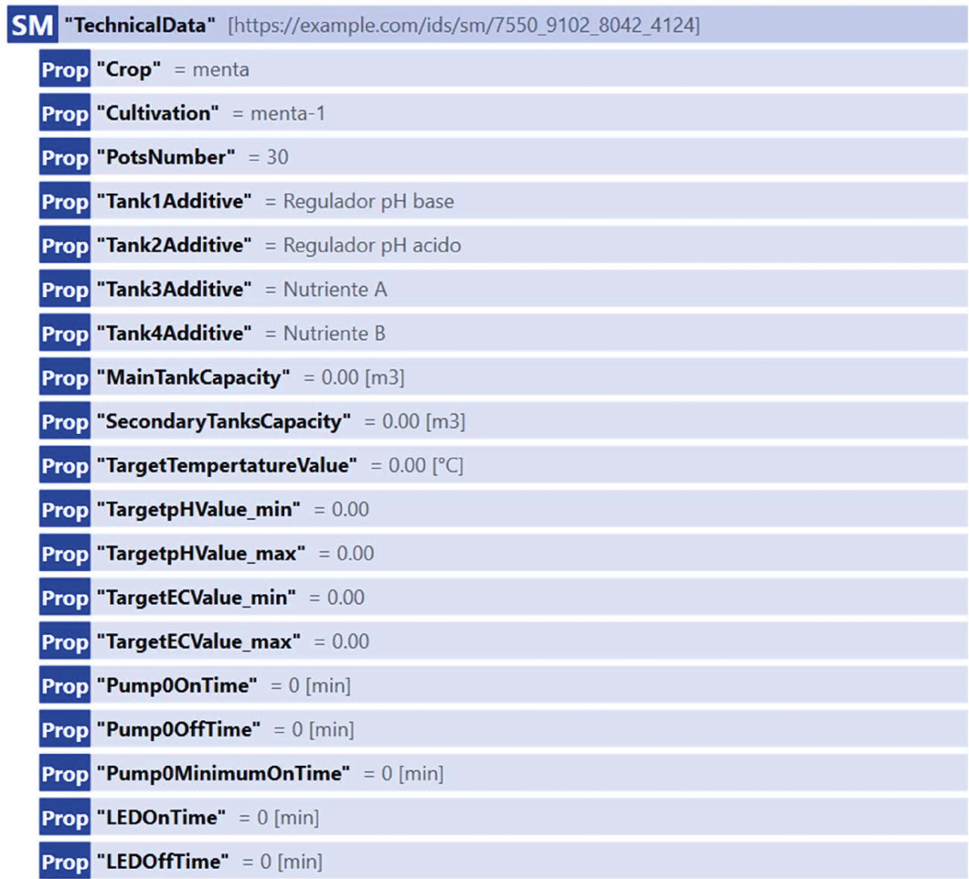 Submodelo “TechnicalData”: Datos técnicos del Sistema Hidropónico Autocontenido.