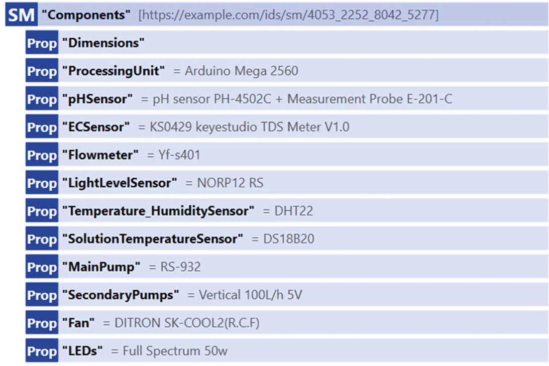 Submodelo “Components”: Información de los componentes del Sistema Hidropónico Autocontenido.