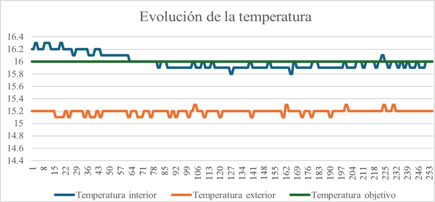 De esta manera, la temperatura se regula correctamente y permite situarla por debajo de la temperatura marcada como objetivo, la cual a su vez podría ser conceptualmente considerada un límite (Figura 13).