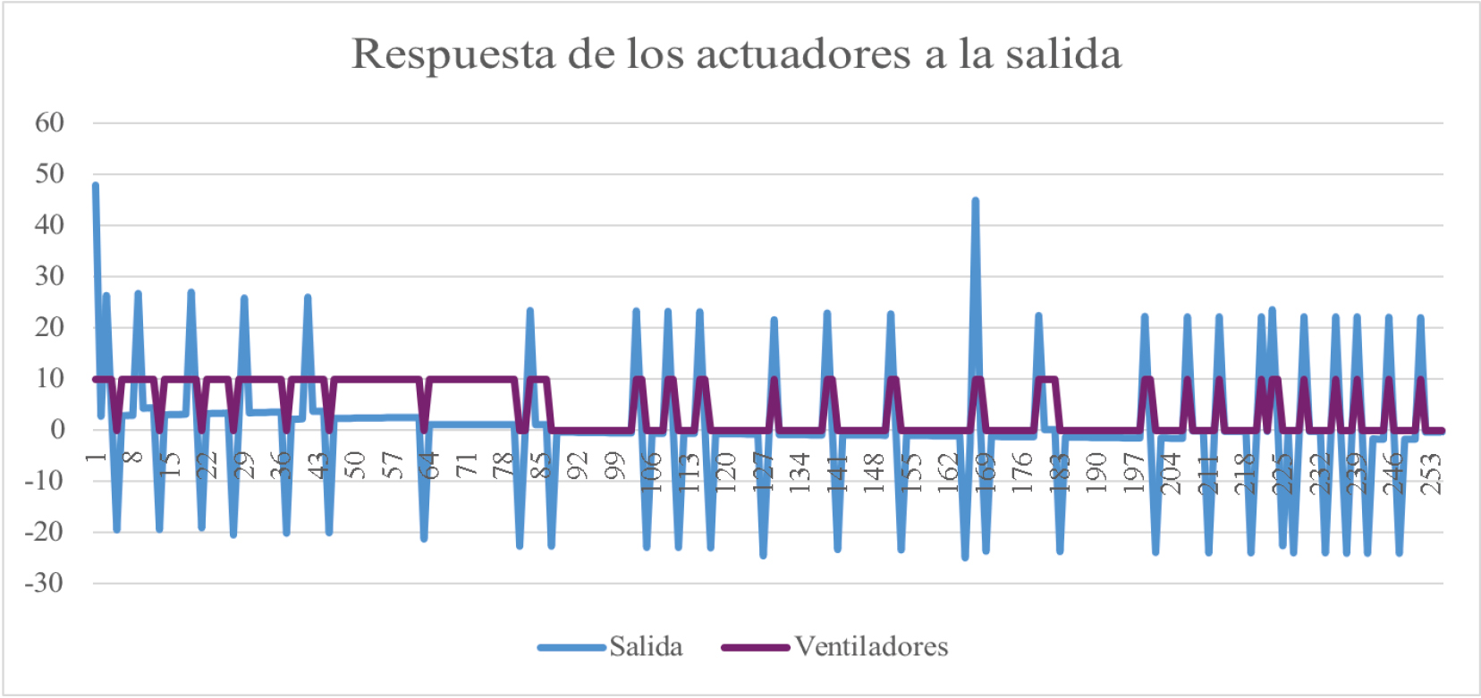 Como se mencionó en la sección que describe el cálculo de los parámetros de configuración de este método de control, la actuación debería ser idealmente llevada a cabo por un dispositivo que permita una variación continua y no que trabaje solo con dos valores lógicos, como es el caso de los ventiladores utilizados en este proyecto, los cuales, por acción de un relé, solo pueden encenderse y apagarse.
