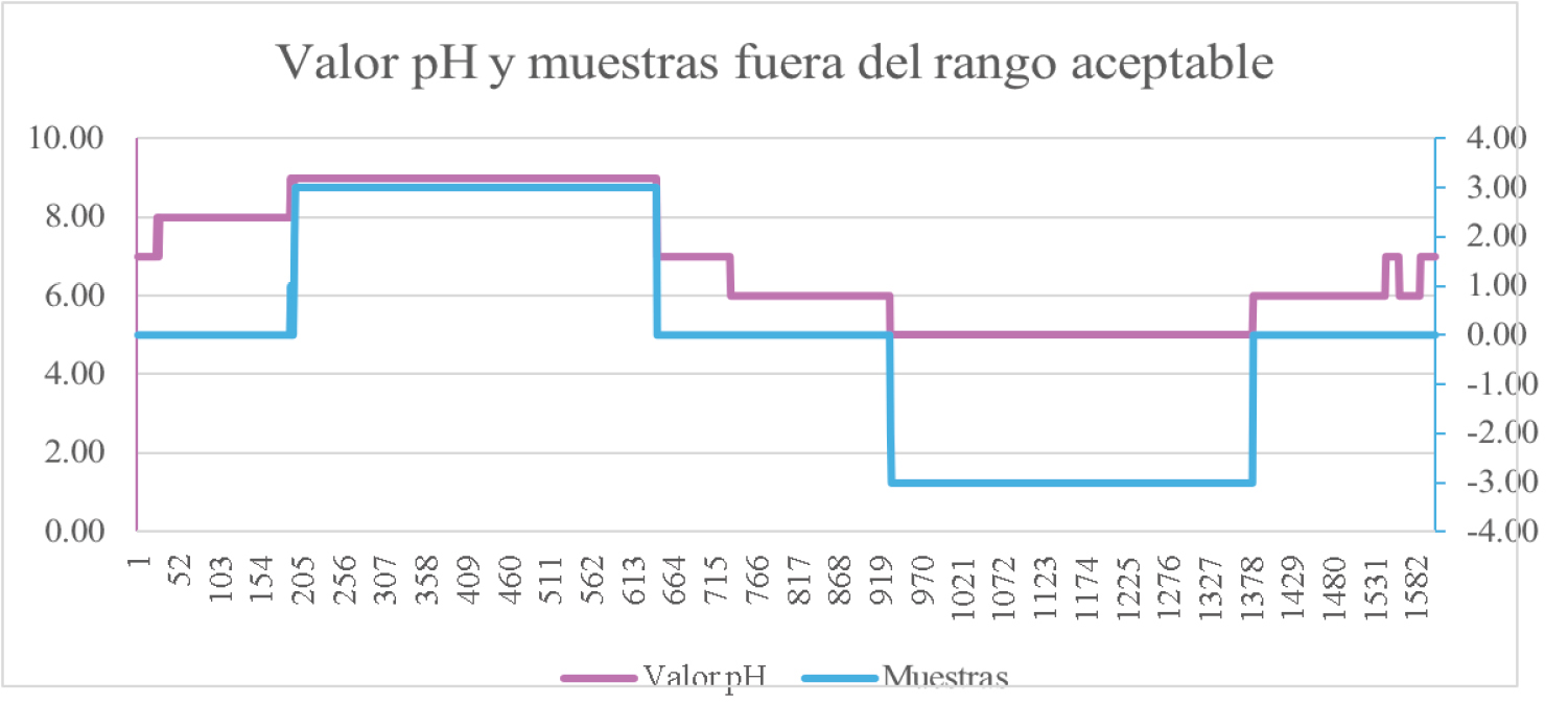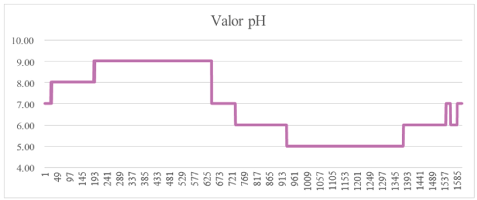 Se puede observar en la gráfica “Muestras” (Figura 16) que instantes antes de llegar a las tres muestras positivas se produjeron algunas mediciones por encima del valor aceptado de pH, pero no las suficientes como para obtener tres consecutivas. Este mecanismo se utilizó como filtro para evitar que una medición errónea pueda afectar al sistema. En este caso de prueba se utilizó el valor “3” pero como se aprecia en el código, podría configurarse a otro valor. Solo se actuará si se alcanza dicha cantidad de medidas consecutivas fuera del rango aceptado.