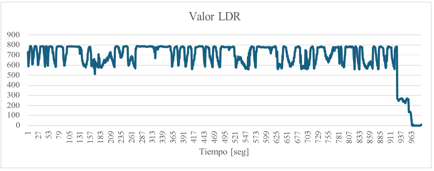 Se sigue el siguiente procedimiento: se verifican 3 escenarios: iluminación total, parcial y oscuridad. Se conecta al pin analógico de placa Arduino, cuyo rango de mapeo es 0-1023 valores digitales y una frecuencia de muestreo de 1 segundo. Los valores fueron tomados cada un segundo y permitieron componer la gráfica que se muestra en la Figura 6.