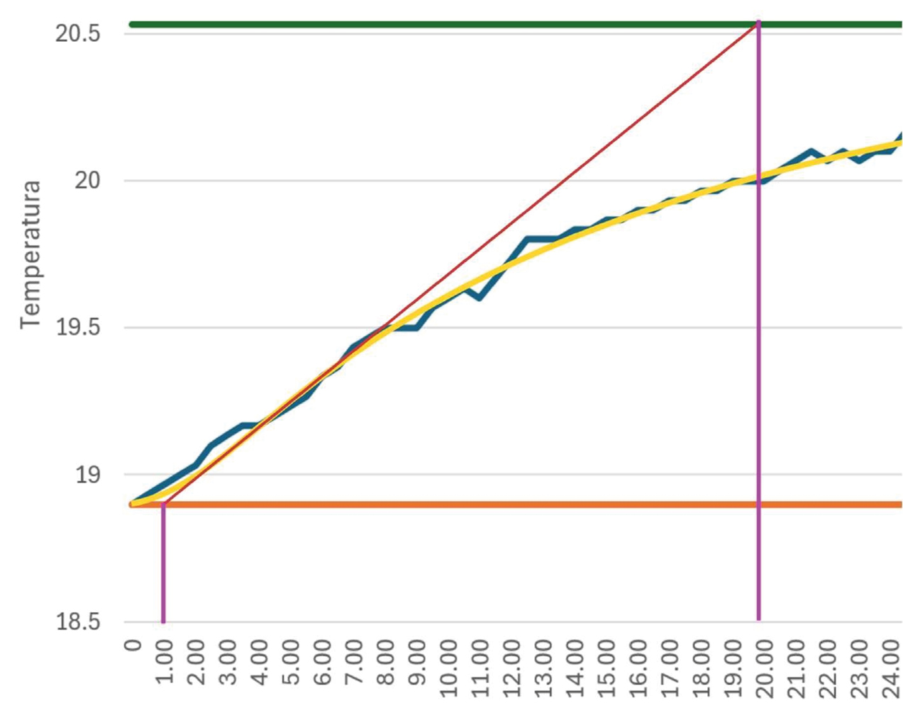 En la Figura 4, la curva azul que muestra la evolución de la temperatura a lo largo del tiempo fue aproximada por la curva amarilla para facilitar el análisis. Esta curva tiene una forma de S, caracterizada por dos parámetros clave: el tiempo de retardo (L) y la constante de tiempo (T). Para determinar estos parámetros de manera gráfica, se dibuja una línea tangente (roja) en el punto de inflexión de la curva en S, y se identifican las intersecciones (rosa) de esta tangente con las líneas que representan los valores iniciales (naranja) y finales (verde).