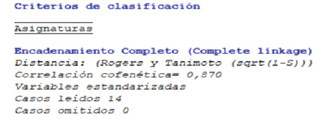 El análisis jerárquico de clúster, realizado con distintos métodos de enlace y métricas de similitud, permitió distinguir perfiles diferenciados de prácticas pedagógicas. El coeficiente cofenético alcanzó un valor óptimo de 0,870 para la variable criterios de evaluación (A03) utilizando el método de encadenamiento completo con la distancia de Rogers y Tanimoto. Este resultado indica que, en este conjunto de datos, la agrupación resultó estadísticamente robusta, lo cual refuerza la validez de los perfiles identificados.