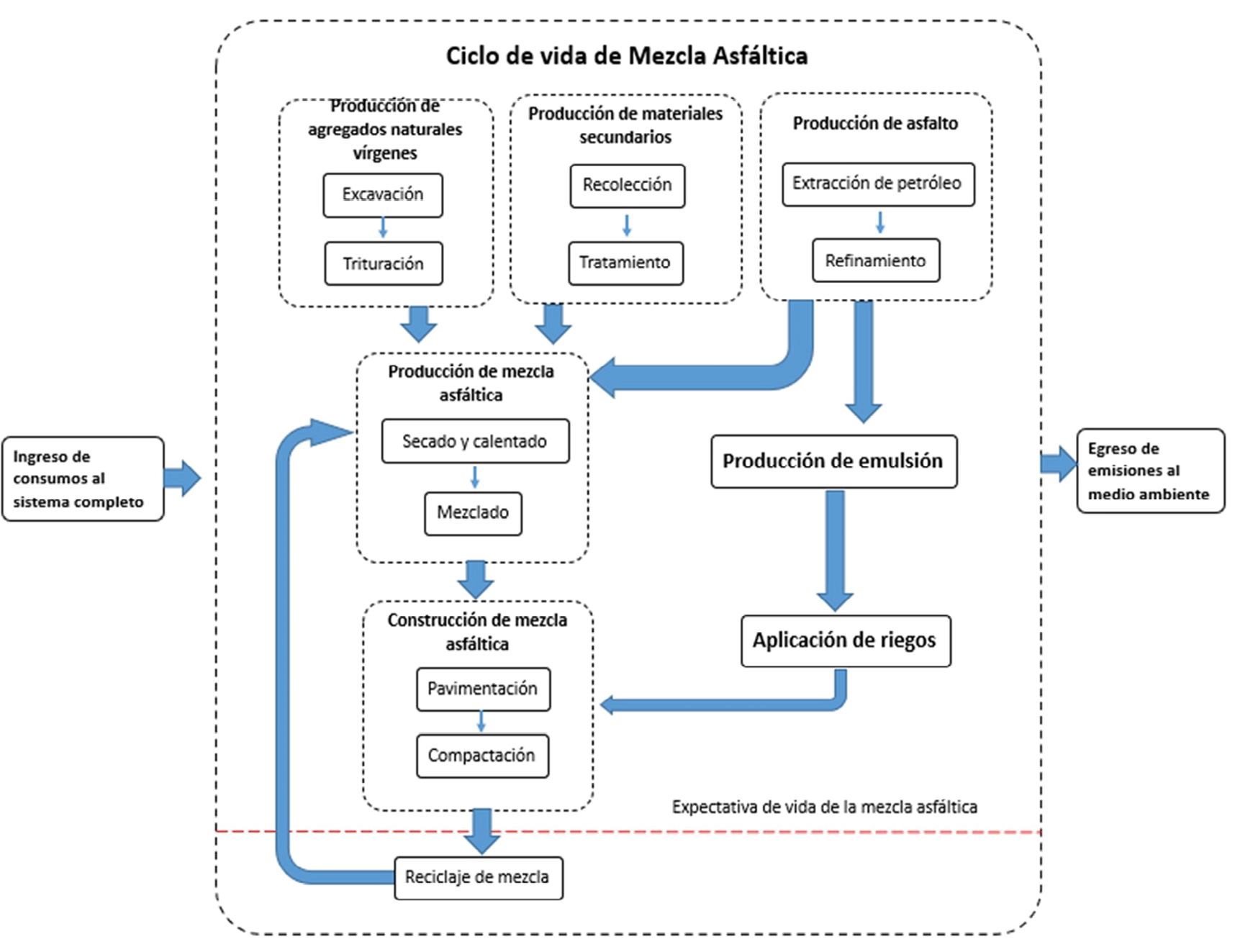 En cuanto a estos estudios aplicados a mezclas asfálticas, existen diversos estudios para analizar procesos o materiales innovadores para evaluar el impacto en algún indicador de interés. En líneas generales los estudios siguen un proceso similar al que se muestra en la Figura 1. Este cuadro muestra la extracción de materias primas como piedra partida, asfalto y cal. Luego la elaboración de la mezcla asfáltica en la planta y por último la construcción de la misma. Según el análisis se estudia también la fase de uso de los usuarios por la carretera y el fin de vida útil del material que considera la disposición final de los materiales. En todos los pasos intermedios se debe contemplar el traslado de los materiales entre los diversos puntos de estudio (Huang et al., 2009).