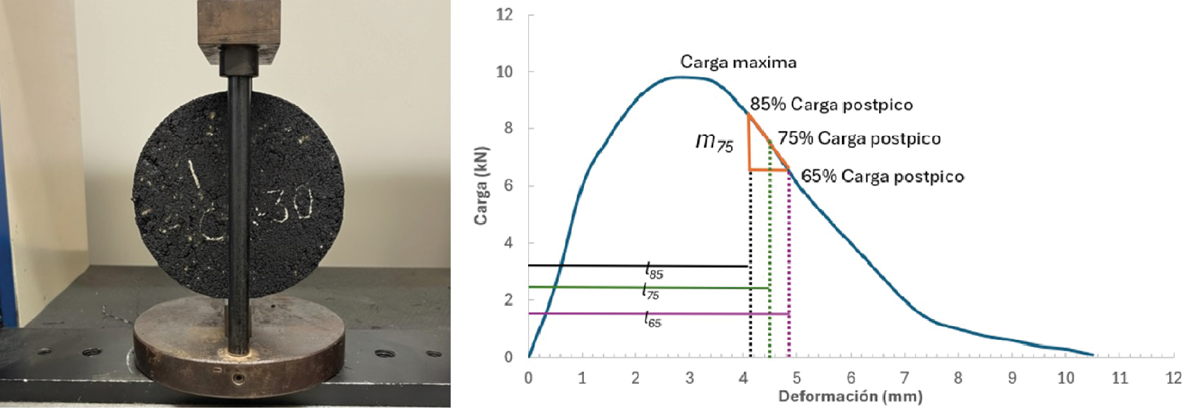 En particular, para el análisis se utiliza el ensayo de Tracción Indirecta Estática (TIE) según la norma ASTM D8225-19. Mediante un análisis complementario se extraen índices que tienen en consideración la fisuración que puede experimentar la muestra en su vida útil. Uno de los índices más divulgados actualmente es el Cracking Test Index (CTI). El mismo considera la tenacidad de la probeta como así también los puntos de inicio de la fisuración de la probeta. La probeta dispuesta para el ensayo en conjunto con la curva representativa del ensayo se puede ver en la Figura 2 (Zhou et al., 2017).