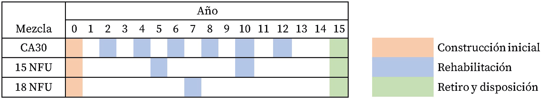 Para todas las mezclas analizadas, se adopta un período de análisis de 15 años, correspondiente a una vida útil estándar para capas de rodadura en vías urbanas. No obstante, la cantidad de intervenciones necesarias a lo largo de ese período varía notablemente según la mezcla utilizada, en función del análisis planteado.