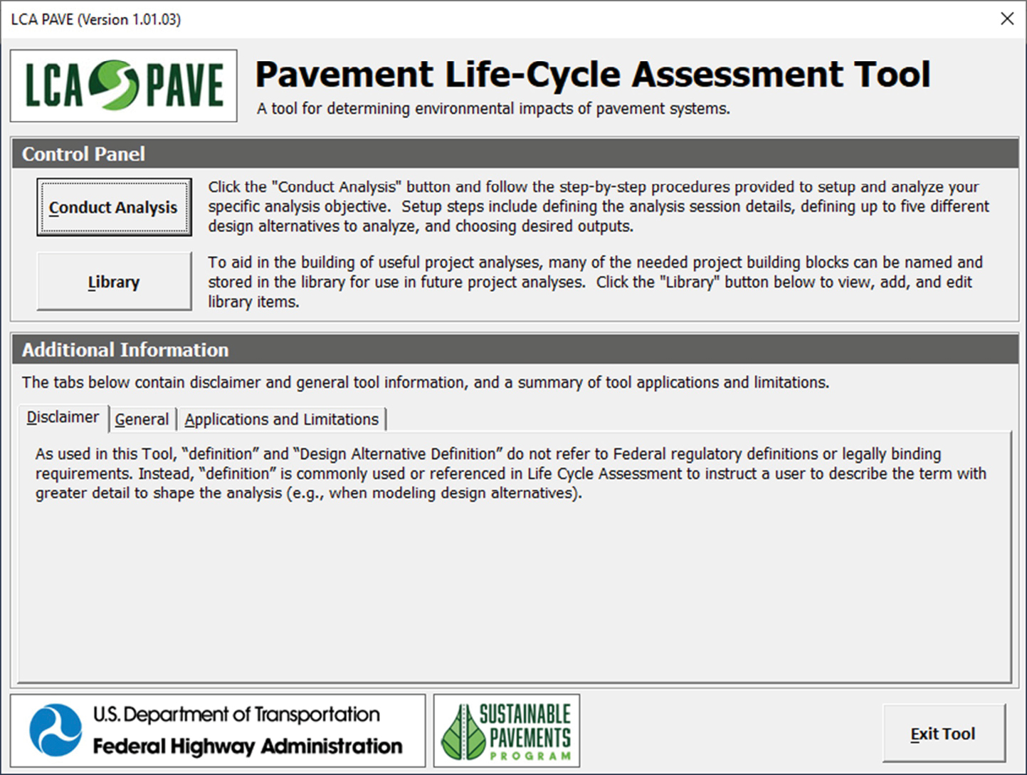 Para ello, se utiliza la herramienta computacional LCA Pave, un software especializado desarrollado en una planilla de Excel para la evaluación ambiental de pavimentos desarrollado por el Departamento de Transporte de Estados Unidos cuya portada se ve en la Figura 4 (FHWA, 2021). Dicho programa permite modelar las distintas etapas del ciclo de vida y cuantificar indicadores como el Potencial de Calentamiento Global (GWP), el consumo energético, y la emisión de contaminantes atmosféricos. Para el estudio, se define la unidad funcional utilizada que es de 1 km de pavimento flexible de base asfáltica de 10 cm de espesor. Se aclara que la base de datos utilizada para cuantificar los consumos y emisiones son de datos locales del software ya que se tiene muy poca información propia de este tipo de información.