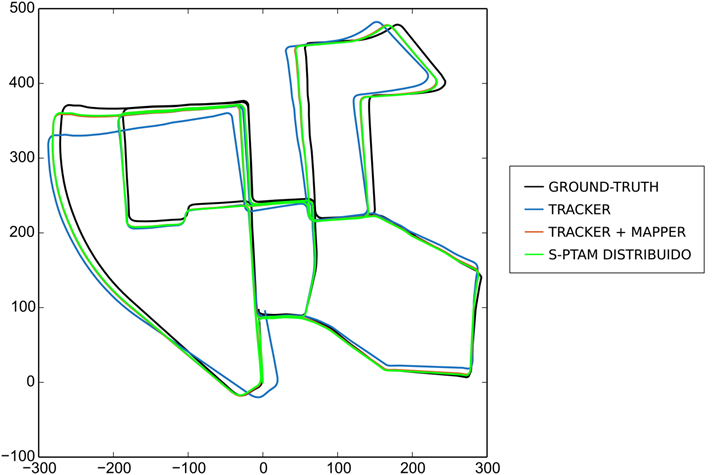 La Figura 4 muestra la comparación entre las trayectorias estimadas por el sistema propuesto (para distintas configuraciones) contra la trayectoria real realizada por el vehículo (ground-truth). El color celeste representa la trayectoria para la ejecución del nodo Tracker en la PC, mientras que en rojo se muestra la trayectoria para la ejecución de ambos nodos (Tracker y Mapper) en la misma PC. Finalmente, en color verde, la ejecución distribuida de los nodos en la que Tracker fue ejecutada en la PC mientras que Mapper se ejecutó en la notebook.