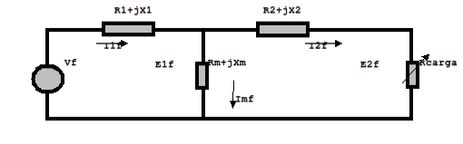 Uno de los métodos de cálculo de los valores de funcionamiento de un motor eléctrico trifásico consiste en el uso del circuito equivalente (Fraile Mora, 2008: 259-334; Chapman, 2005: 380-431; Liwschitz-Garik y Whipple, 1974: 177-209); este circuito (Fig. 1) está formado por tres ramas: 1) la correspondiente a una fase del primario o bobinado del estator (rama primaria), 2) la correspondiente al comportamiento del circuito magnético (rama derivada) y 3) la correspondiente a una fase del secundario o rotor (rama secundaria), cuyos parámetros están reducidos al primario .