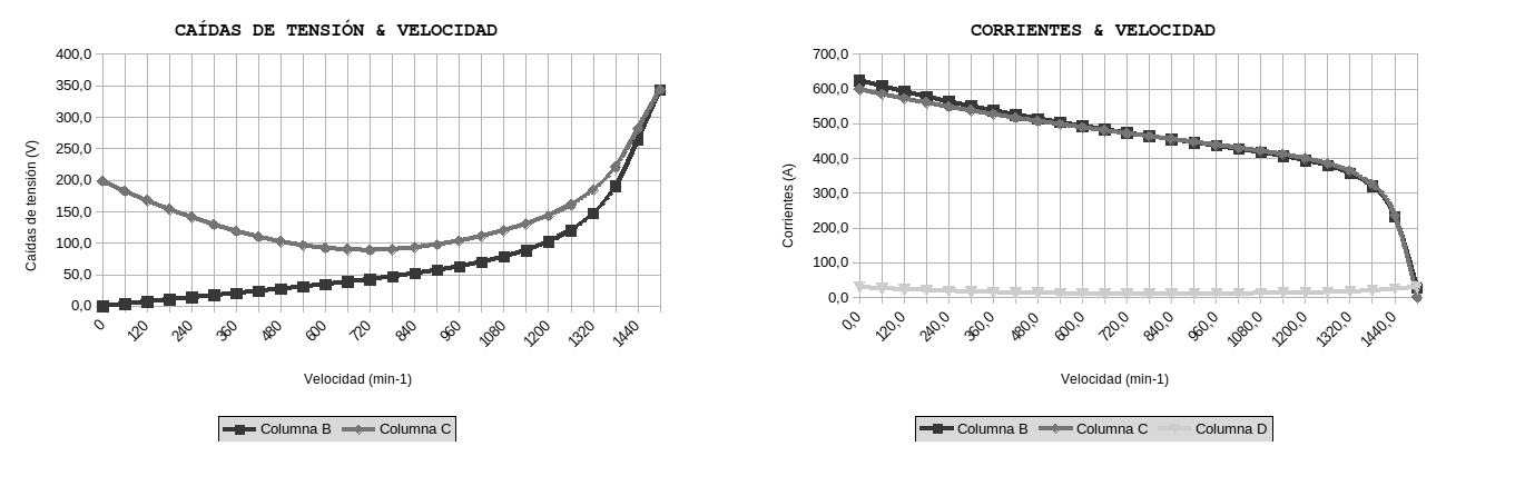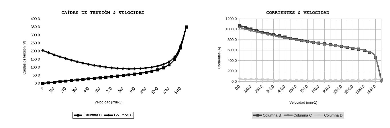 c) Cálculos aproximados de exigencias: ampliamente justificados por autores tradicionales reconocidos (Corrales Martín, 1976: 380-430; Crisci, 1956: 675-815) , estos valores se prestan a ser valiosos auxiliares de referencia para proyectos o diseños de máquinas. Las curvas de corrientes y de caídas de tensión reflejan sus variaciones con la velocidad en cada tramo del circuito, permitiendo aplicarlos a cálculos de máximos y mínimos en distintas zonas del motor.