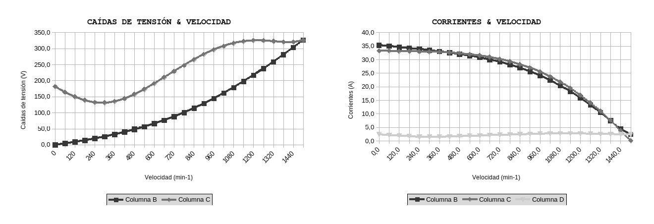 Fig. 7. Curvas de caídas de tensión y corrientes, 75 kW, 4 polos