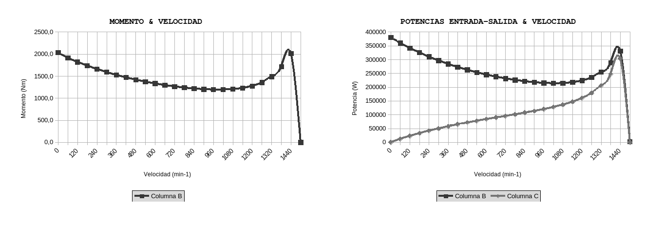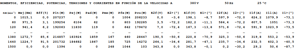 b) Curvas de momentos y corrientes, en función de la velocidad: las formas de las curvas se acercan a lo indicado por los estudios especializados y los catálogos; sin embargo existen, como ya se dijo, diferencias considerables con las gráficas del fabricante en la zona media de la curva. Esto conduce, además de necesitar un mayor número de comparaciones con dichas curvas del fabricante y analizar estadísticamente los resultados, a repensar la valoración de pérdidas y las leyes de variación de las impedancias, adaptándolas, muy probablemente, a cada tipo de potencia y velocidad de motor. En caso de prototipos de motores, en los que no existan curvas de referencia, será necesario obtener algunas estimaciones sobre las desviaciones de los valores teóricos calculados.