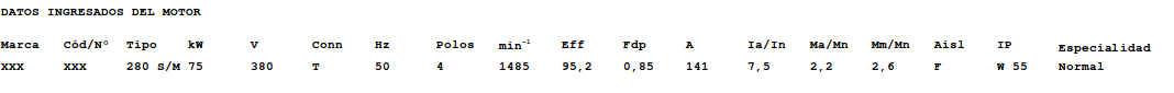 a) Ingreso de datos iniciales del motor: se ingresan y confirman los datos identificatorios y característicos del motor, requeridos en posteriores cálculos. Se muestra, como ejemplo, la devolución del software, para un motor de 75 kW y 4 polos, en tabla 1.