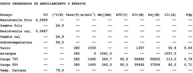 Tabla 2. Devolución de datos de arrollamiento y ensayos, 75 kW, 4 polos