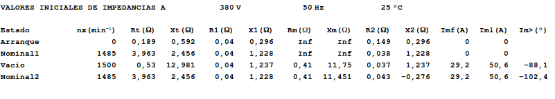 La bibliografía especializada (Liwschitz-Garik y Whipple, 1974: 227-246) y las experiencias de ensayos (Gallo, 2017), fundamentan que los valores de impedancias indicados son propios para cada estado de carga, porque varían en todas las velocidades (desde el arranque hasta vacío) del motor.
