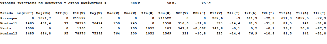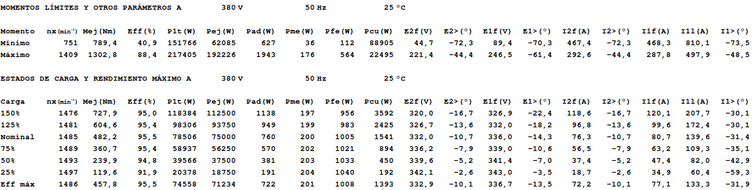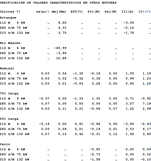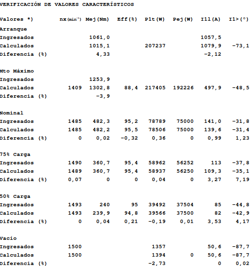 a) Comparación con datos de ensayos: La comparación con datos de ensayos o del fabricante (punto f del título anterior), para el motor de 75 kW, devuelve los resultados mostrados en tabla 9.
