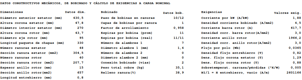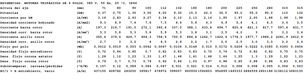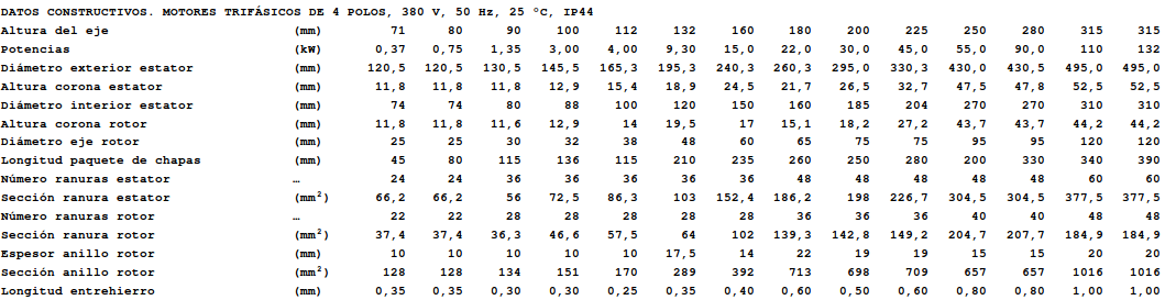 d) Elaboración de tablas comparativas anexas: opcionalmente y como una extensión de las prestaciones del programa, resultaría de utilidad elaborar una tabla con datos constructivos (tabla 11) y una comparativa (tabla 12) de valores de exigencias para distintos tamaños y potencias de motores. Como ejemplo, se muestran las correspondientes a una linea comercial de motores de 4 polos.